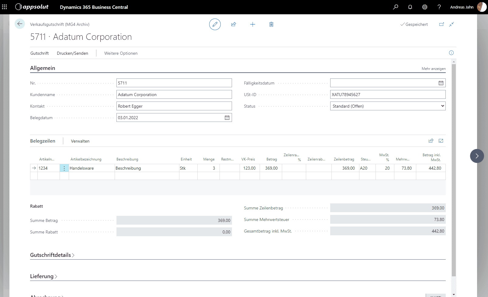 - Bearbeiten: Schaltet die Verkaufsgutschrift in den Bearbeitungsmodus.