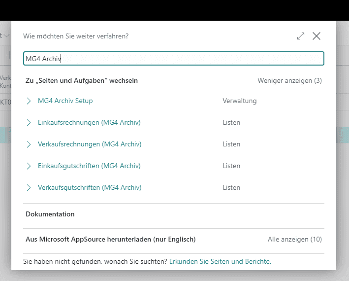 Tragen Sie den Suchtext "MG4 Archiv" ein, um die Funktionen des MG4 Belegarchivs zu filtern.